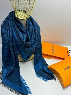 Платок брендовый шерстяной 1127 из тонкой шерсти с шелком синего цвета с черной монограммой. Край - бахрома без обработки, орнамент -монограмма. Синий цвет шали настолько универсален, что сочетается с одеждой практически в любом стиле и цветовой гамме. При сочетании с оранжевым выбирайте более темный оттенок синего или яркий синий в небольшом количестве.